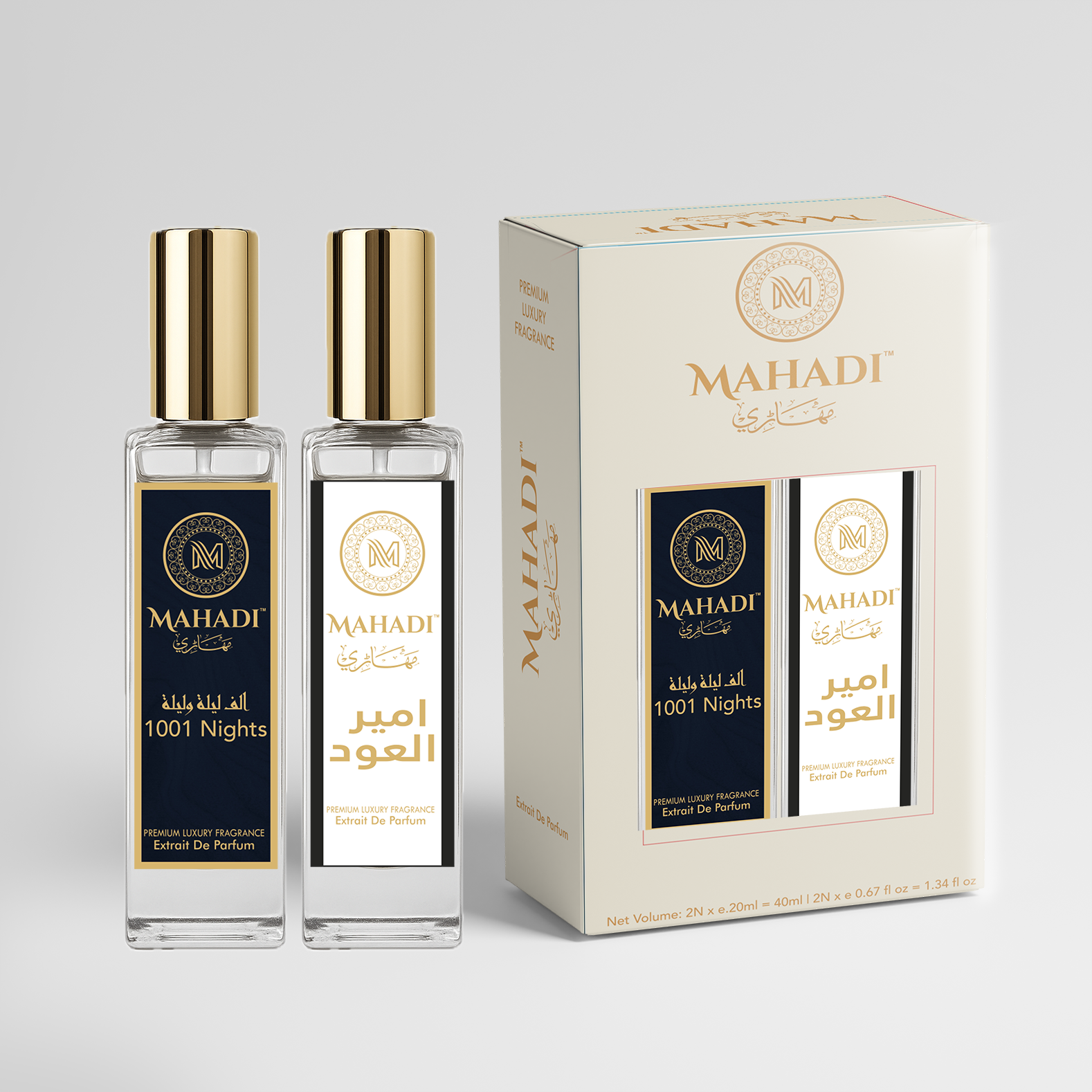 Elevate your fragrance collection with the Mahadi Luxury Perfume Gift Set, a refined duo crafted for lovers of rich, long-lasting Arabian perfumery. This premium set presents two enchanting Extrait De Parfum masterpieces—1001 Nights and Ameer Al Oud, each bottled in elegant 20ml flacons that reflect true sophistication.