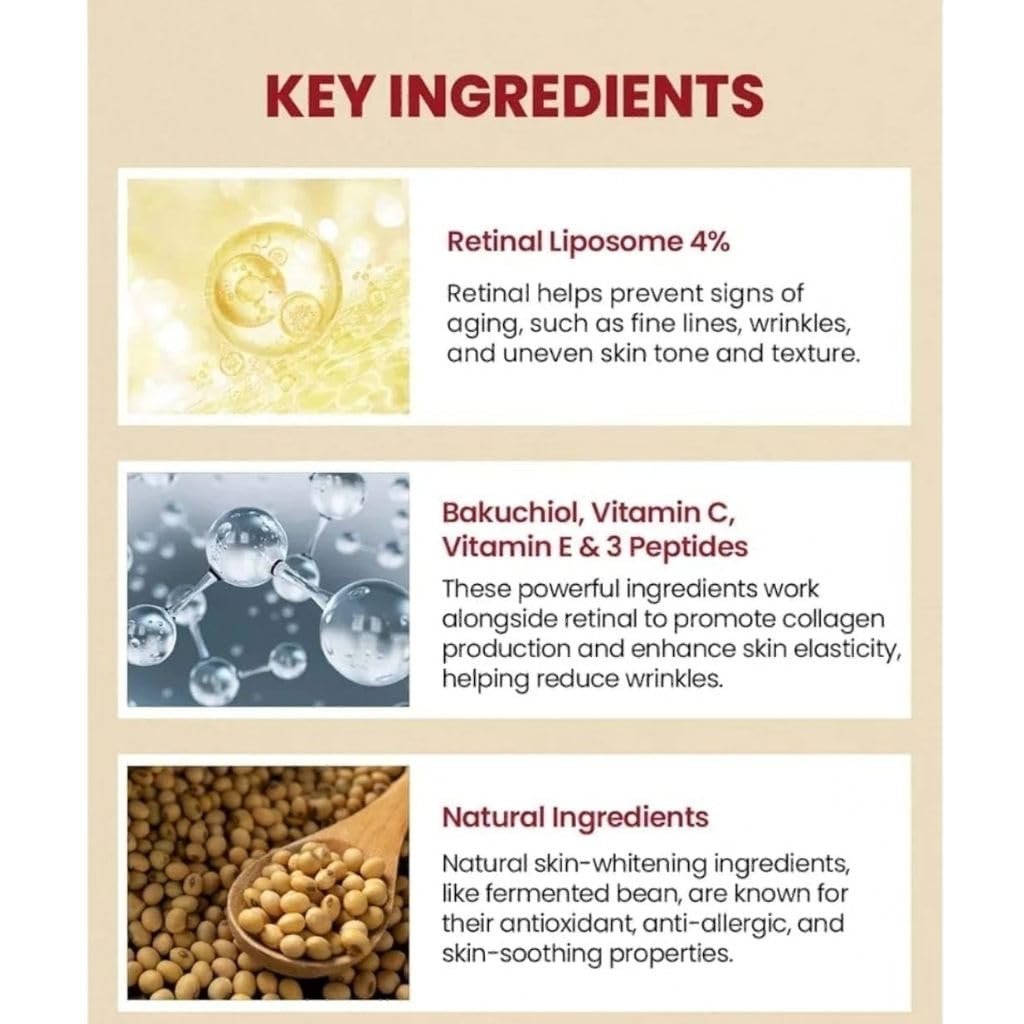 Fermented Bean Extract for Deep Repair Enriched with Fermented Bean extract that delivers essential amino acids and antioxidants to nourish, repair and brighten the delicate under-eye skin. A refined micro-particle ingredient, 16 times thinner than pores, is designed to penetrate directly into pores and enhance the absorption of active ingredients. Through high-purity separation and refinement, the particles are uniformly sized, reducing skin irritation. Infused with 0.1% retinal, the advanced form of retinol, combined with A-Shot, designed to directly penetrate pores and enhance absorption, delivers retinal deep into the skin to target wrinkles and enlarged pores, promoting smoother and firmer skin. Reduces Dark Circles & Puffiness Targets stubborn dark circles and under-eye bags. Helps minimize puffiness and gives your eyes a fresh, well-rested and brighter appearance.